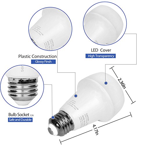 Product Specifications: Power Supply: 120V AC,60Hz Lamp Socket: E26 Power Consumption: 9.5 W Brightness: 800 Lumens Beam Angle: 200 degrees Sensor detection distance: 30 feet Sensor detection angle: 100 degrees Color Temperature: 2700K - Soft White CRI: 83 Dimensions: 106 mm (H) x 60 mm (Dia.) / 4.17"(H) x 2.36" (Dia.) Lifetime: 25,000 hours Limited warranty : 3 years from the date of original purchase