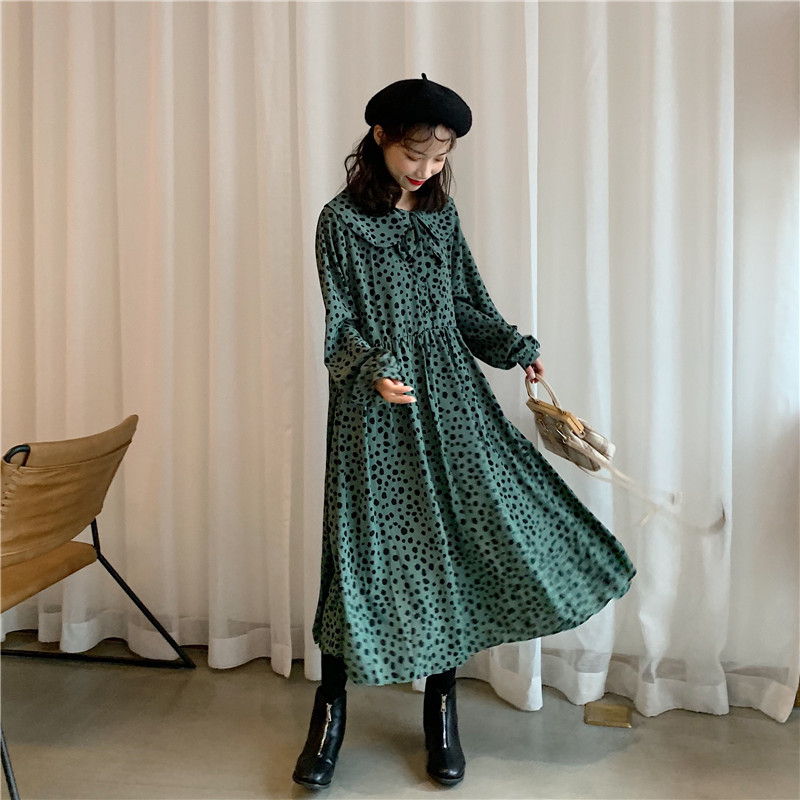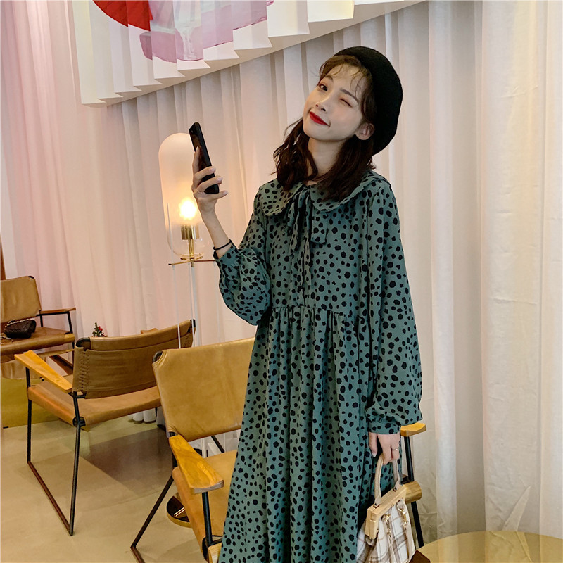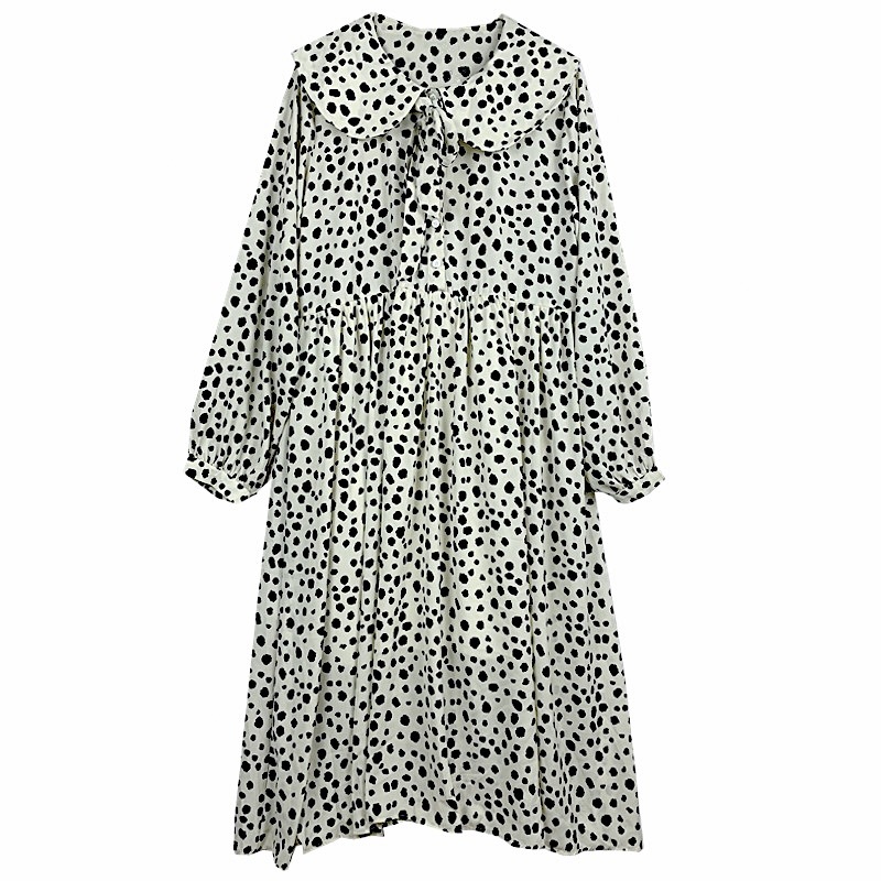 ワンピース 長袖 ミモレ丈 キュート ゆったり デート リボンタイ ナチュラル服 アニマル柄