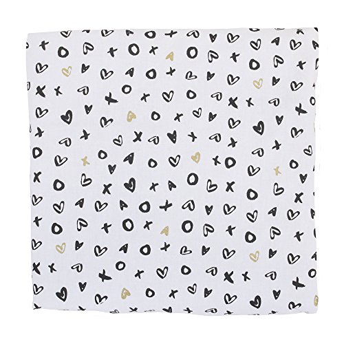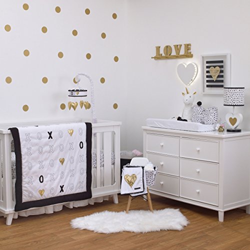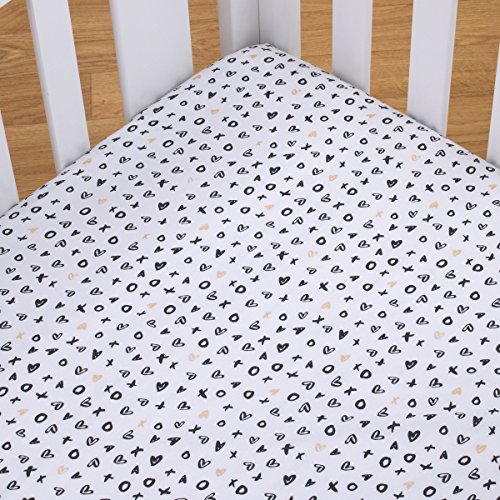 -. Binding : Baby Product -. Brand : NoJo -. Color : White -. EAN : 0085214111018 -. Feature : This NoJo Cotton Fitted Crib Sheet is a stylish addition to your baby's nursery and features black X's and O's and metallic gold hearts / Fabric is 100% cotton, providing the optimal mix of durability, beauty, breathability, and ease of care / Fitted sheet is fully elasticized with an 8 inch pocket to fit all standard sized 52 by 28 inch crib mattresses; designed specifically to make those middle of the night sheet changes quick and easy / Made with busy new moms in mind; just machine wash and tumble dry / Complete your nursery decor with coordinating crib bedding and accessories from the NoJo XOXO Collection -. Label : Crown Crafts -. Manufacturer : Crown Crafts -. Model : 4772003 -. MPN : 4772003 -. PartNumber : 4772003 -. ProductGroup : Baby Product -. ProductTypeName : BABY_PRODUCT -. Publisher : Crown Crafts -. Studio : Crown Crafts -. Title : XOXO Black Gold and White Fitted Crib Sheet by NoJo -. UPC : 085214111018
