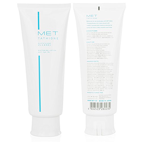 -. Binding : Misc. -. Brand : Met tathione -. EAN : 0011711603497 -. Feature : This lotion is a Glutathione-rich cream infused with Vitamin C that prevents dark melanin production for lighter skin. Moisturize for an overall glow with MET lotion. Helps prevent dark melanin production while keeping the skin young and smooth. / 150ml Tube. Lotion is a Glutathione rich cream infused with Vitamin C that prevents dark melanin production for lighter skin. / Make skin visibly smoother and firmer. / This Glutathione rich topical product also contains ingredients such as Hyaluronic acid, Glycerine, Ascorbic acid, and Squalane. / It is the perfect lotion that moisturizes and whitens the skin at the same time. -. IsAdultProduct : 0 -. MPN : FF17T -. NumberOfItems : 10 -. PackageQuantity : 1 -. PartNumber : FF17T -. ProductGroup : Beauty -. ProductTypeName : BEAUTY -. Title : MET Tathione Glutathione Whitening Lotion - 150mL -. UPC : 011711603497