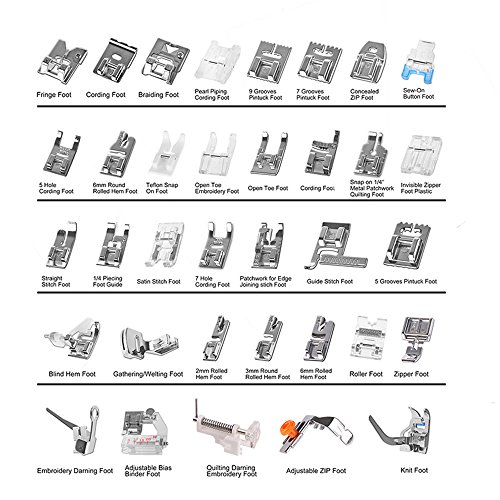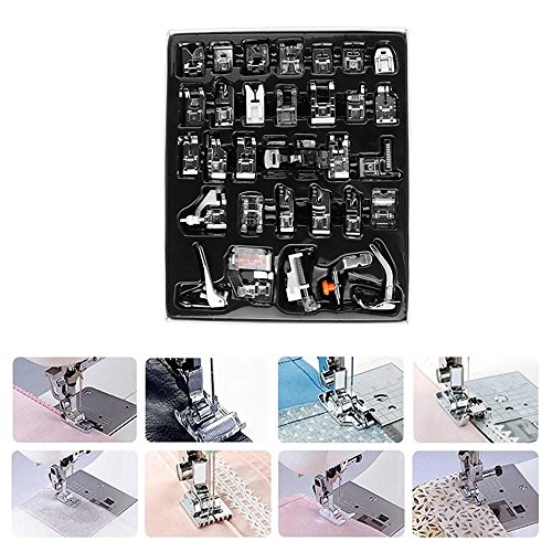 -. Feature : Total 36pcs sewing machine presser feet kit for most of household multi-functional sewing machines. / Fits most home domestic sewing machines built after 1980 that have a low-shank system. / Fits most sewing machine brands such as such as Brother, Butterfly, Singer, Janome, YOKOYAM, Fanghua505A, Feiyue, Juki, IKEA and other low-shank domestic sewing machines. / Compact Kit, you can use them as a fashion accent on blouses and dresses, as border for sheer curtains, or as a flounce for bedspreads, skirts, etc. / 12 Months Warranty: 100% Money Back Guarantee if you are not satisfied with the purchase.