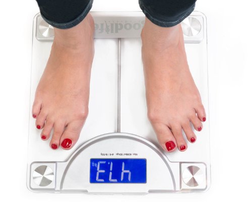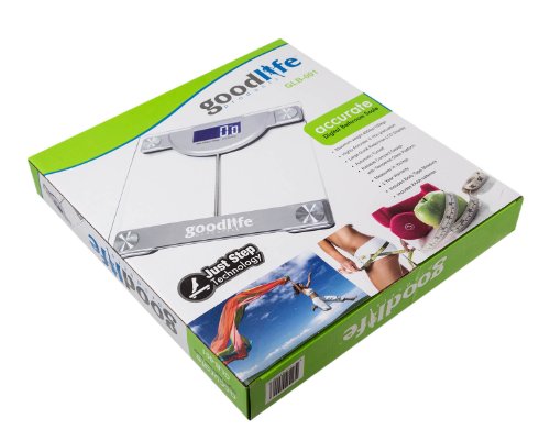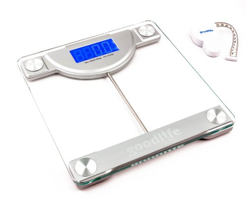 -. Feature : WEIGHT CAPACITY - of 400 lbs /180 kg with Graduation Increments of 0.1 lb (most precise in current market). Has 4 High Precision GoodLife Accurate Sensors that Measure in Real Time. Does not 'Snap' current reading to old reading. / USER FRIENDLY - Large 3.5" LCD display w/ Bright White Digits on Cool Blue Backlight - Easy to read even in low lit areas of the house and Readable from any distance or angle. Beeps when weight is Locked-in and holds reading for 10-seconds. Runs on 2 AAA batteries - Included to start you right away!! / ERGONOMIC SLEEK DESIGN with Solid 8mm ultra thick tempered glass platform - 1" off ground for added stability;100% GoodLife Satisfaction Guarantee / FREE GOODLIFE BODY TAPE MEASURE now included - Another important tool to promote Healthy Life Style! / ***LOWEST PROMOTIONAL P.R.ICES AVAILABLE FOR A LIMITED TIME ONLY***on our Digital Bathroom Scale.