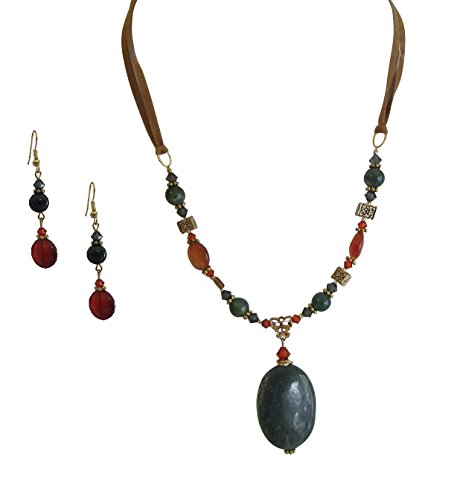 This stunning, artisan, handcrafted in the USA necklace and earring set features a 1.5 inch moss green natural stone pendant accented by amber-tone crystal and gold tone stamped findings on a rust colored suede double cord. Topping off this set are matching dangle earrings. This lovely artisan jewelry set makes a perfect gift and will arrive to you in a box appropriate for gift giving.