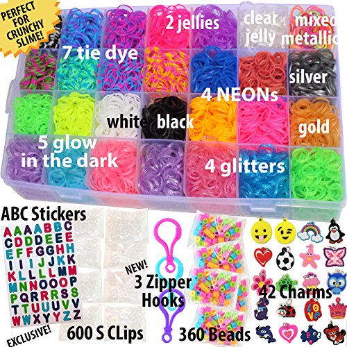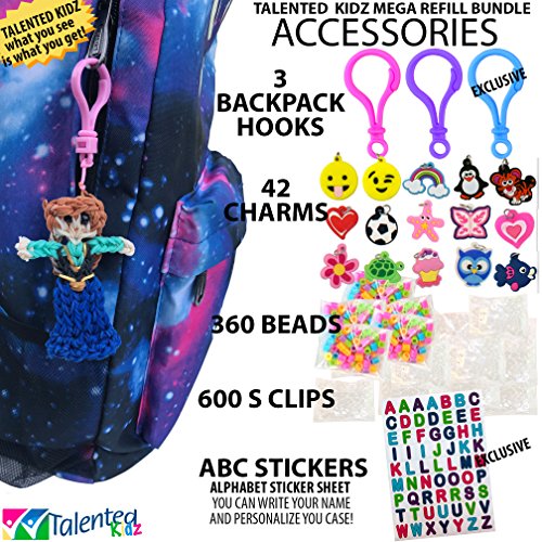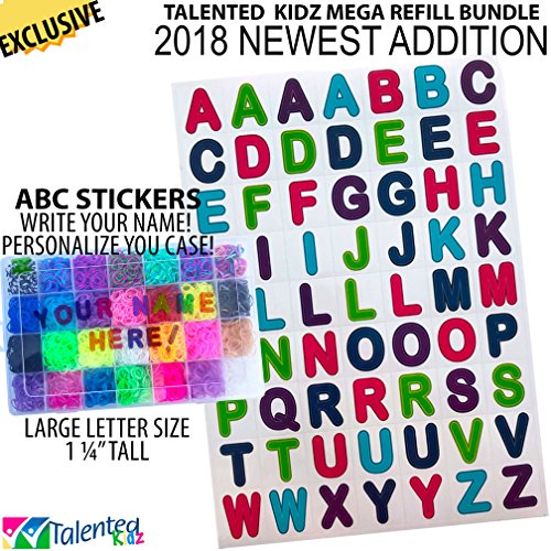TALENTED KIDZ ORIGINAL RAINBOW MEGA REFILL CASE in SPECIALTY COLORS by TALENTED KIDZ! Most unique, largest assortment on Amazon, with Tie-Dye, Jellies, Neons, Metallics, Glitters are more! Authentic and exclusively offered by Talented Kidz, be aware of imitatorsWHAT YOU SEE IS WHAT YOU GET!The bundle includes over 10,600 rainbow rubber bands in over 30 colors, 550 S-clips, 42 charms, 3 backpack hooks, 300 beads & ABC stickers.