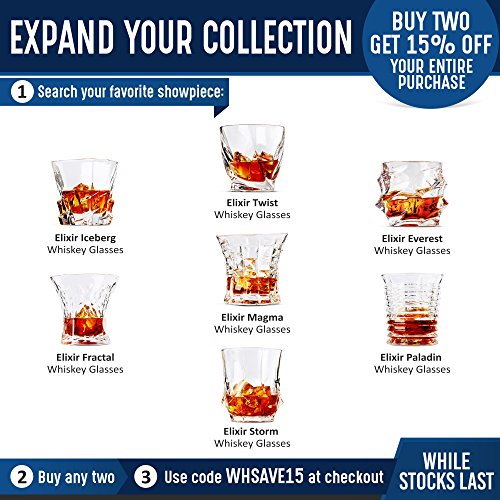 Studio : Elixir Glassware Publisher : Elixir Glassware Product Description Experience unparalleled luxury and sophistication. Take your enjoyment of fine whiskey to new heights with the stunning whiskey glass set by Elixir Glassware - click ADD TO CART now. ★ Luxury Awaits You ★ At Elixir, we design timeless pieces that blend seamlessly with the purest form of indulgence - resulting in a sensory experience that is exceptional to behold. We believe that, like the craftsmanship of our glasses, a fine whiskey should be relished, savored, never rushed. ★ A Timeless Gift That Thrills Inspires ★ Instantly impress with a uniquely lavish, elegant whiskey glass gift set, wrapped in an opulent embossed, textured classic black gift box. Enjoy brilliantly clear glass that immediately strikes the eye as the sweeping, sculpted lines glint in the shifting light. This is a gift that boldly takes centre stage and proudly proclaims distinction above the rest. Transform the home bar impress your guests, friends, and loved ones with a timeless showpiece that will be appreciated and admired for years to come. ★ Our 100% Satisfaction Guarantee to You ★ At Elixir, we continually strive to bring you and your loved ones the very best in beautiful, elegant glassware. Occasionally small air bubbles or spots do occur in the manufacture of lead-free glass products, because of the added complexities of working with ultra-clarity glass. If for any reason you are not 100% satisfied with your Elixir purchase, we will send you a replacement set or a full refund, no questions asked. This is our unconditional promise to you. Luxury awaits you - ORDER NOW. Product Features 9 oz Old Fashioned Glasses (Set of 4) Embossed Textured Gift Box - Magnetic Enclosure, Protective Foam Inset (Custom Moulded) 0