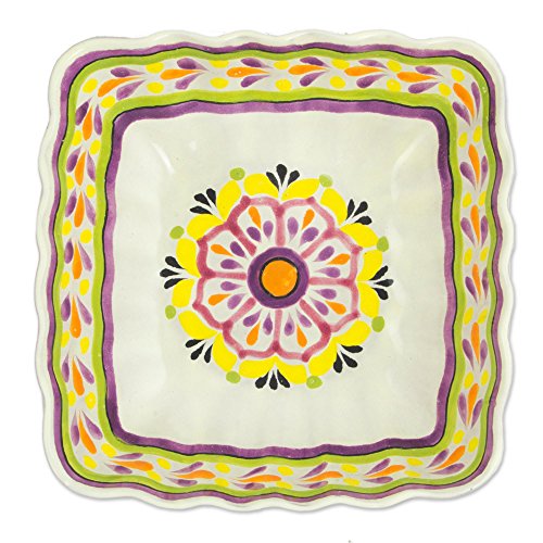 NOVICA Hand Blown Multicolor Ceramic Serving Bowl, 'Square Mexican Lavender'