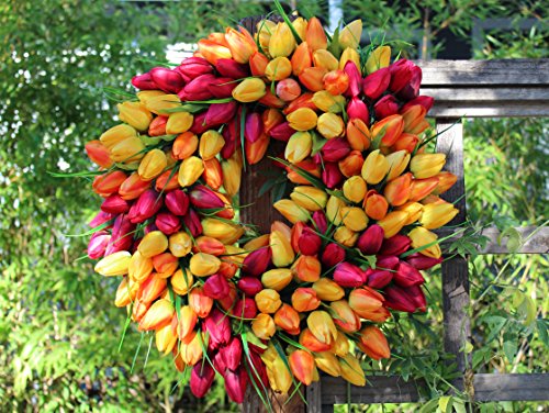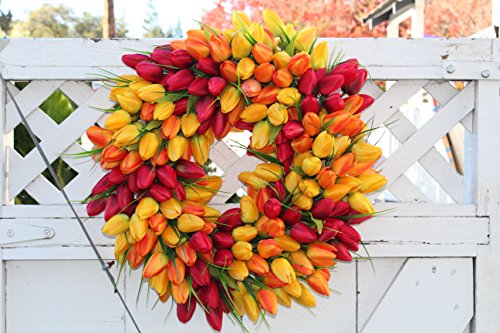 The Wreath Depot has designed the perfect tulip spring wreath. Full, lush designer silk tulips are crafted with care on a natural wreath base. This a shapely, full front door wreath that adds a touch of springtime to any home or decor.
