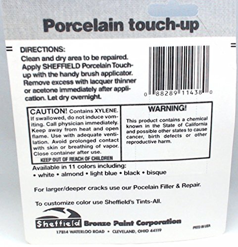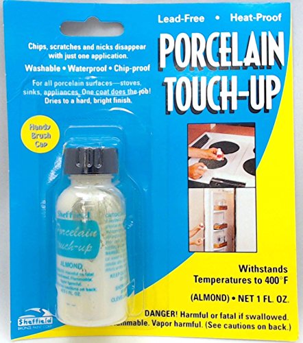 Sheffield's Porcelain Touch Up will not turn yellow. It gives a hard, waterproof, glazed finish to any chipped porcelain or tile surfaces on drain boards, bathtubs, refrigerators, and stoves and withstands temperatures of up to 400 F. Restores your belongings to their natural and original beauty. It comes in a ready to use. 1 oz. bottle with a handy brush cap for instant no fuss application.Feature