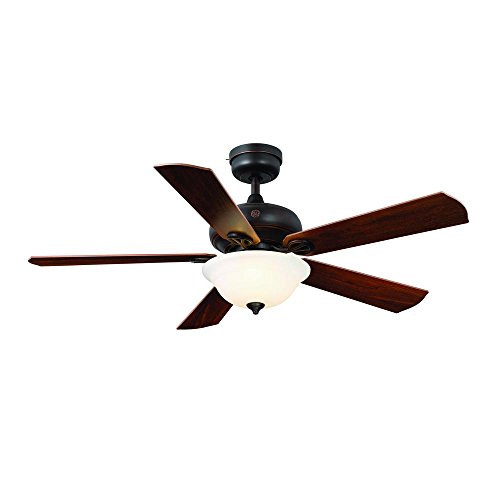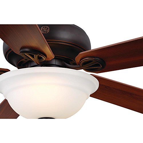 The GE Selena 54 in. Ceiling Fan, with its classic and stylish design, will complement any room and is offered in brushed nickel or bronze finishes. The fan features the new and technologically advanced GE SkyPlugTM Mounting System to provide safe, quick and easy installation. This innovative Plug & Play feature eliminates complicated wiring, and allows the fan to be easily taken down, or switched out with a large variety of ceiling fans and light fixtures within seconds! The fan includes a 3-speed remote control (with wall mount) that operates both the fan and the dimmable LED light kit. The light kit has 3 LED light bulbs, included, and are housed in a white frosted glass shade. The GE Selena 54 in. Ceiling Fan is built with high quality GE specifications and includes a limited lifetime motor warranty.Feature