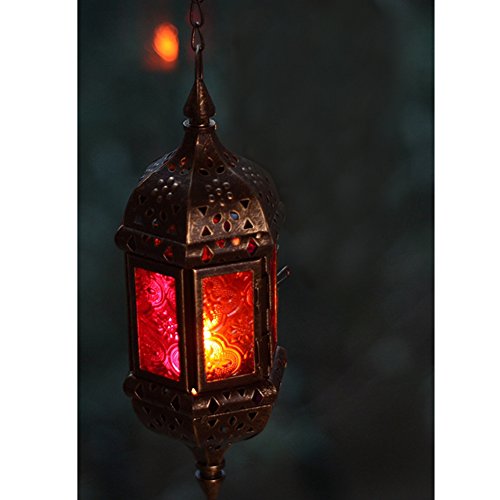 -. Feature : Unique style- these chandeliers are not just lanterns, candlelight, it is for your garden or porch, living room, bedroom adds color and exotic atmosphere / Fine Material- Moroccan candle lanterns are carved with iron and embossed glass, colorful stained glass and hollow iron shade in any space with a unique pattern divergence of light, absolutely beautiful, mysterious / Size- candle holder 23CMx 8CM, attached a 40CM iron chain for hanging, the top has a round hook, easy to chain hoisting. / Popular- Due to the style, the P.R.Ice of the economy and the overall craftsmanship, they are a popular choice for designers. The real Moroccan-style lanterns are unique works of art / Applicable Occasions- Uses tea-light or votive size candles only. very suitable for weddings, parties, full of candles, hanging in the space above the bedroom or bedroom, living room, porch, hotel decoration, holiday decoration