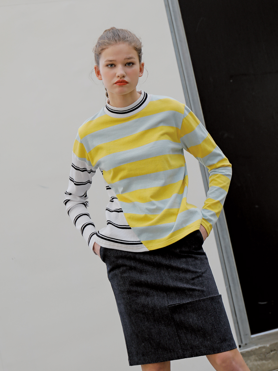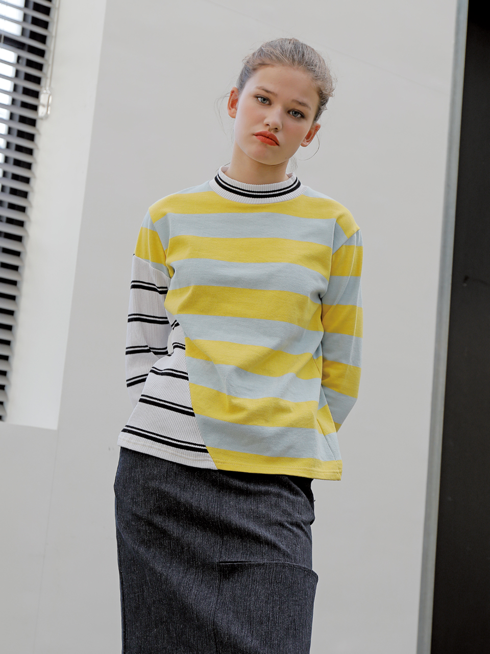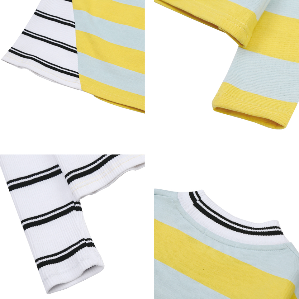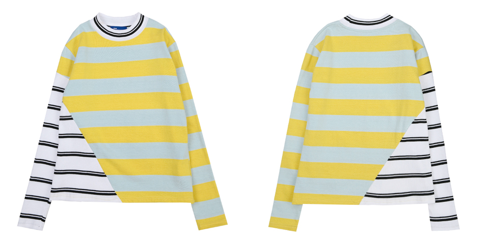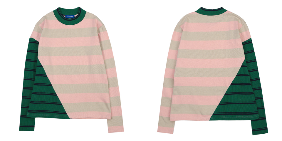독특한 사선 커팅 디테일의 롱 슬리브 티셔츠입니다. 골지 素材의 스트라이프 素材와 볼드한 배색의 스트라이프 素材를 사선 비대칭 컷팅 포인트로 마무리한 제품입니다. 아이보리, 옐로와 그린, 핑크 두 가지 カラー으로 출시되었습니다.
