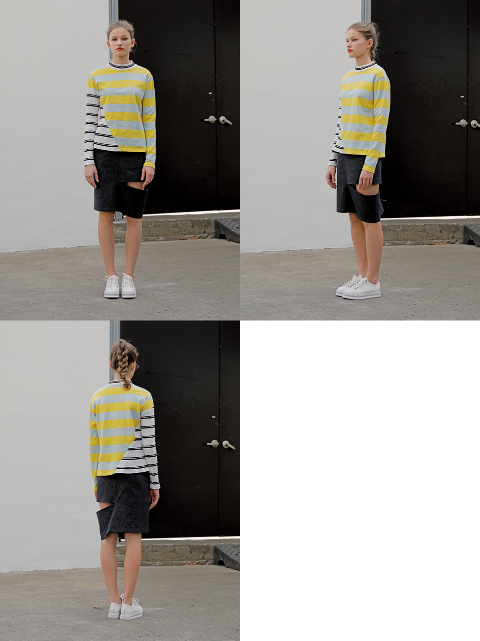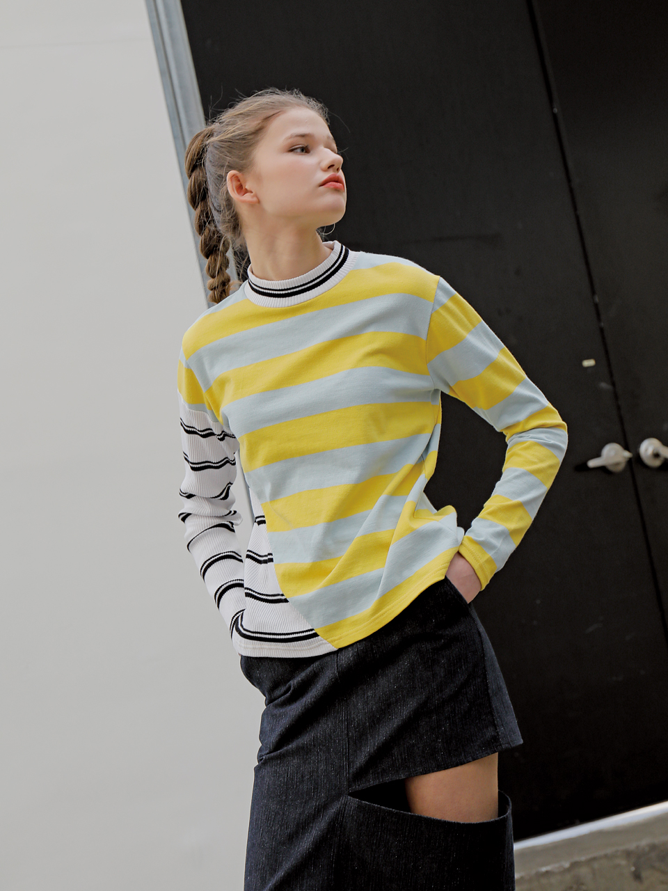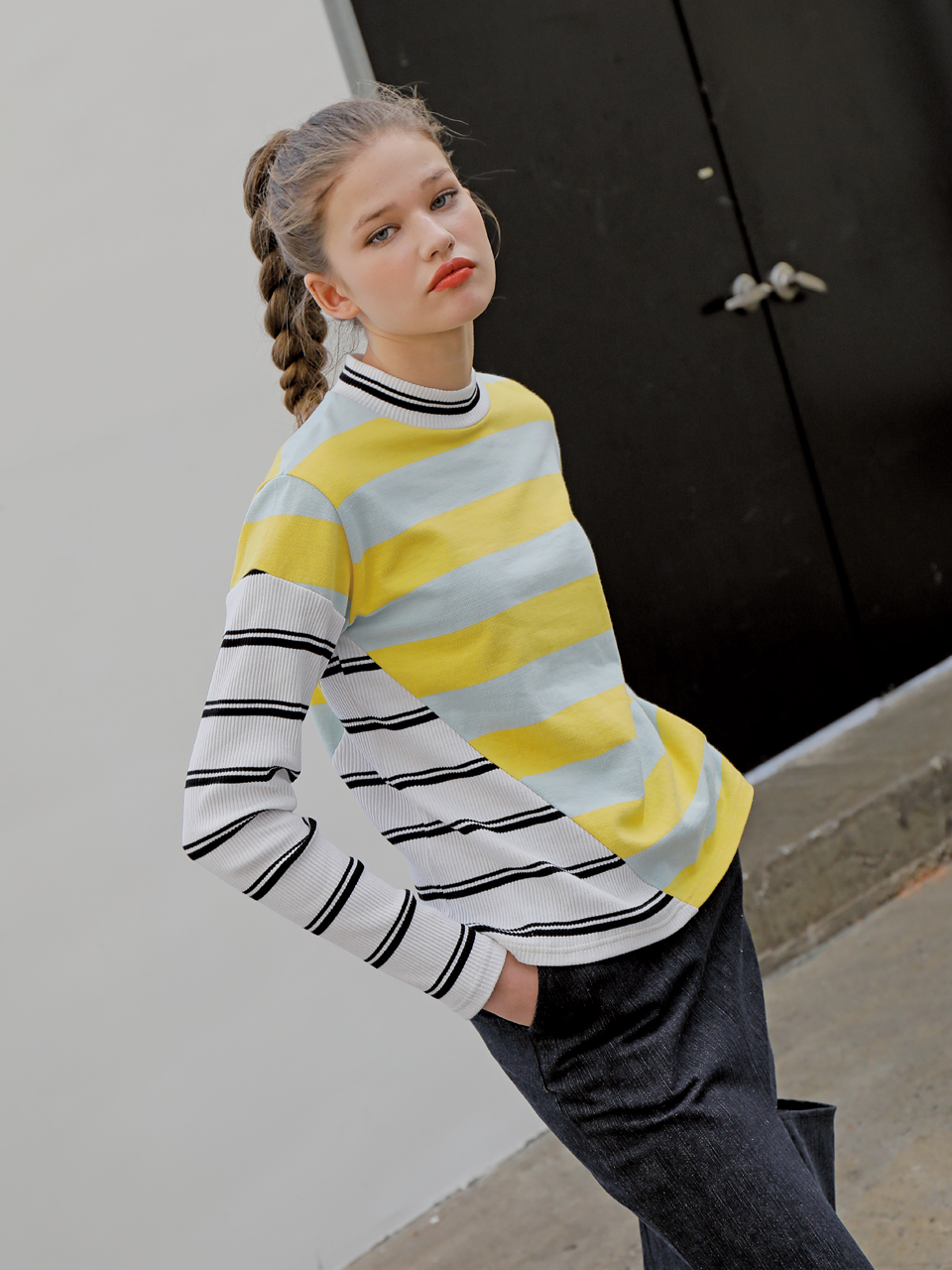 독특한 사선 커팅 디테일의 롱 슬리브 티셔츠입니다. 골지 素材의 스트라이프 素材와 볼드한 배색의 스트라이프 素材를 사선 비대칭 컷팅 포인트로 마무리한 제품입니다. 아이보리, 옐로와 그린, 핑크 두 가지 カラー으로 출시되었습니다.