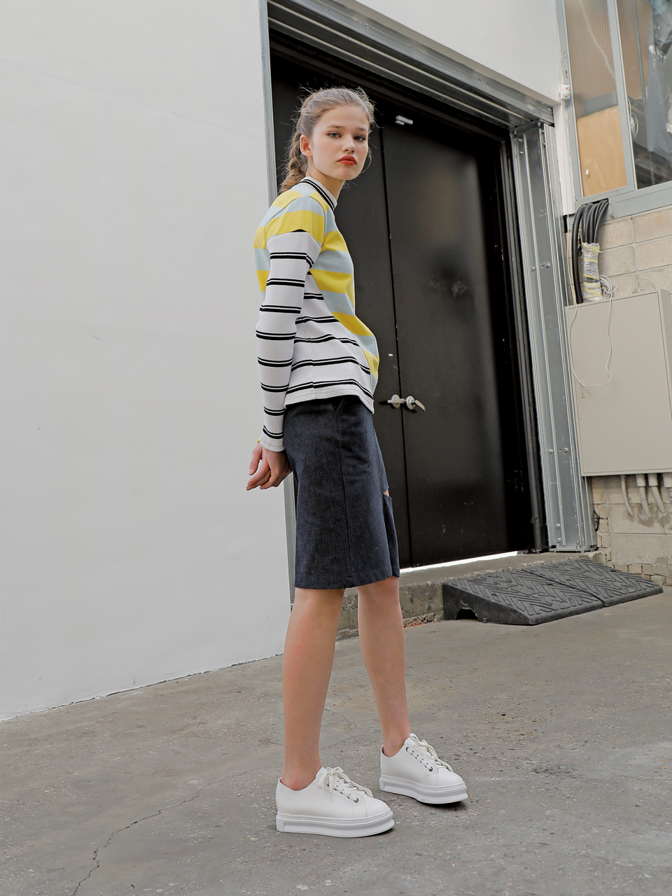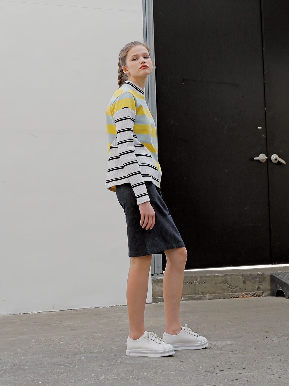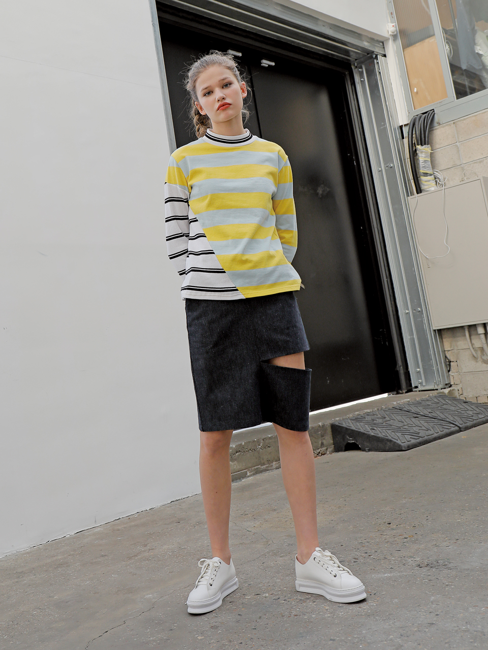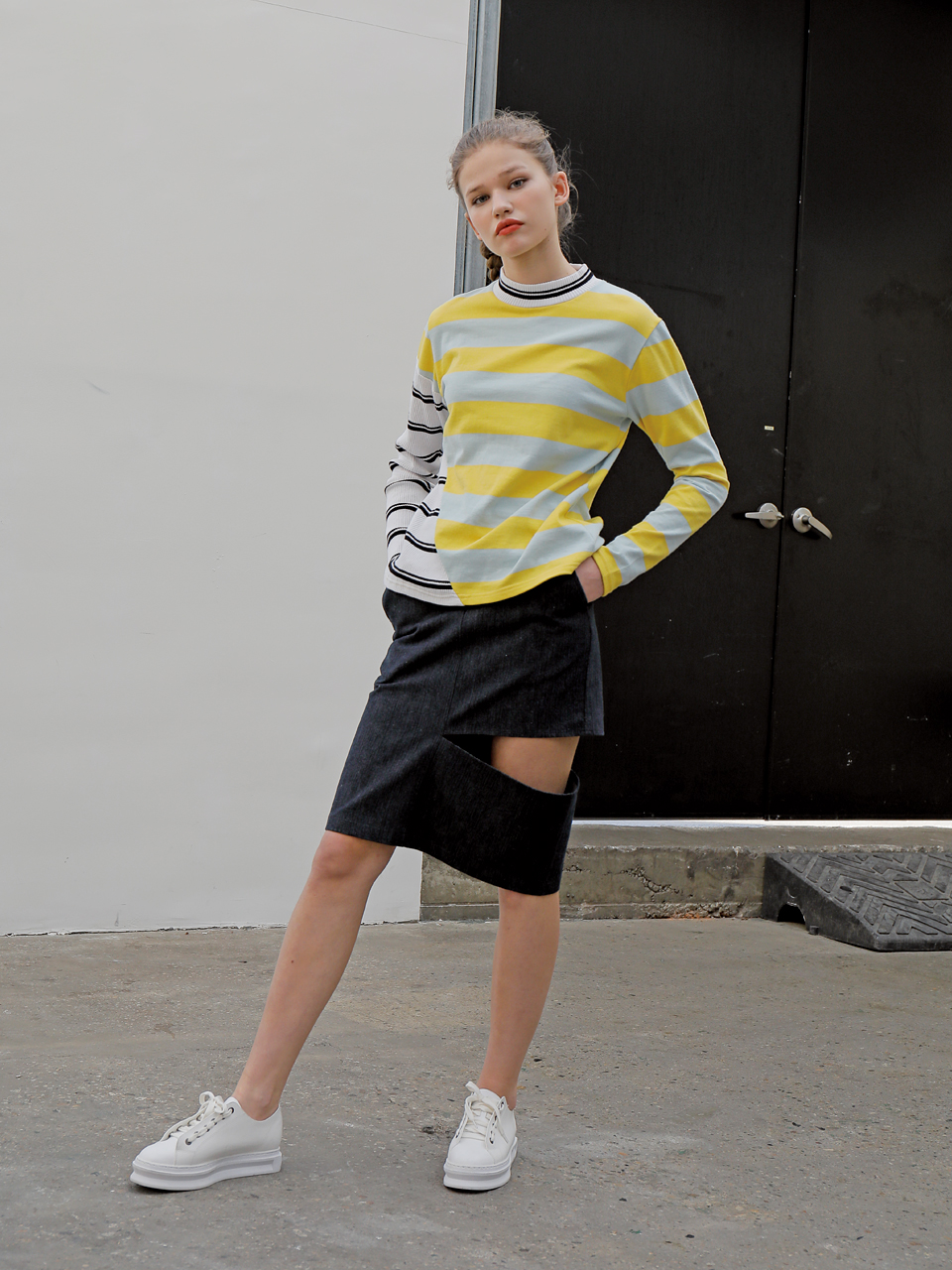 독특한 사선 커팅 디테일의 롱 슬리브 티셔츠입니다. 골지 素材의 스트라이프 素材와 볼드한 배색의 스트라이프 素材를 사선 비대칭 컷팅 포인트로 마무리한 제품입니다. 아이보리, 옐로와 그린, 핑크 두 가지 カラー으로 출시되었습니다.