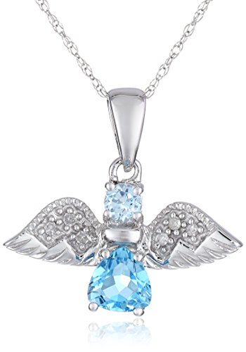 Let this radiant gemstone angel accompany you on all your journeys. Crafted in polished 10 karat white gold, she has a face of faceted sky blue topaz and a gown of deeper Swiss blue topaz. The round and trillion-shaped stones are cradled securely in four-prong settings. Beautifully detailed wings, enhanced with six diamond accents (.03 cttw), complete the design. This dainty angel dangles below a tapered gold bale and presents on an 18-inch light rope chain. Blue topaz is the birthstone for those born in December.Feature