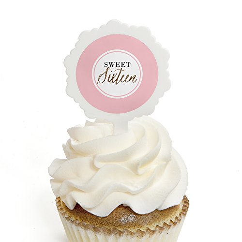 Chic 16th Birthday - Pink and Gold - Cupcake Picks with Stickers - Birthday Party Cupcake Toppers - 12 Count