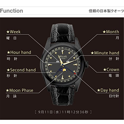 -. Feature : セット内容:本体、ボックス、取扱説明書、保証書は取扱説明書に付属 / 【防水】10気圧(生活防水),【付属品】保証書、専用ボックス,【保証期間】メーカー保証1年間 / 【機能】時間、分、秒、月、曜日、ムーンフェイズ,【ムーブメント】日本製クオーツムーブメント,【サイズ】ケースサイズ:約38mm/ケース厚:約12mm/ベルト幅:約20mm/腕周り約168-215mm,【重量】約64g,【材質】ステンレススチール