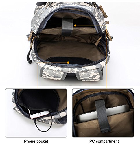 -. Feature : Material: 25L Capacity, Dimensions: 12.21"W x 12.20"H x 5.51"D. Made of Water-resistant 900D Oxford fabric, make the military backpack have strong Waterproof performance and Anti-scratch wear resistance.Good hardware,stronger zippers and buckles ,make it more durable and strengthen ,very comfortable to carry through trails and up and down mountains. / Molle system: The molle straps are great for adding extra pouches.You can load smartphone pouch, water bottle bag, fanny pack/Waist Bag, Messenger Bag,accessory kits and others. There are two morale Patch areas, which you can add favorite unique Patch to decorate this fanny pack and show your style! / Integrated USB Charging Port and Headphone Jack: This backpack is integrated with USB Charging Port, and You will have the ability to sit in the airport, bus, train, whatever and keep your devices charged using the wiring system. There is also an earphone hole at the shoulder strap of the bag, so you can enjoy your music with free hand! / COMFORTABLE: Air cushion shoulder straps help relieve your shoulder stress.Adjustable shoulder length,free to adjust to ideal length.3D honeycomb breathable mesh and high elasticity noodles back cushion,relax the back pressure and impact force,promote the circulation of air,breathable and comfortable. / SUITABLE: Perfect for both daily and outdoor activities.Use it as a carry on for your excess baggage,perfect for day trips,vacation, travel,day hikes,school,camping and shopping.