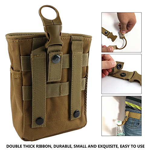 Features ★Climbing Chalk Bag:★ ♥Material: Nylon ♥Cortical features: Oxford cloth ♥Gender: Neutral / Unisex ♥Size: 20x14x9CM/7.87 x 5.5 x 3.6 inch ♥Applicable: Climbing ♥Fabric: 600 * 600D Oxford polyester waterproof fabric ♥Lining: 210D waterproof polyester fabric ♥Features: Molle system, mesh side pockets, waterproof, wearable, portable and washable ♥Uses: Recycling bags, outdoor travel, tactical exercise, camping chalk bag, climbing or other outdoor activities use ♥Colors:Black, Khaki ★Nylon Molle Webbing Camping Carabiner:★ ♥Material: Nylon plastic ♥Material: Double 2.5 polypropylene ribbon plastic hook ♥Product Category: Buckle ♥Series: Outdoor Camping Carabiner ♥Product Size: 14.5cmX2.5cm (folding length: 14.5cm, stretching length: 21cm) ♥Net weight: 21g ♥Specifications: Wide support 5cm belt ♥Uses: Products can be used to hang bottles, wearing belts, backpacks and other items on the use of convenient ★Package Included 1 x Chalk Bag 1 x Nylon Webbing Camping Carabiner 0