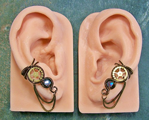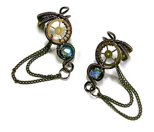 -. Title : Pair of Bronze and Swarovski Crystal Small Woven-Wire Steampunk Ear Cuffs with Chains