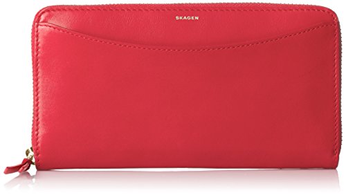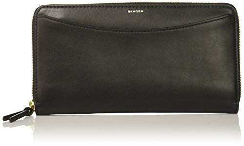 The continental leather zip wallet contains a center zip pocket, two bill slots, 12 credit card slots and a cell phone compartment, with one slip pocket on the exterior. It zips shut by the leather pull tab.