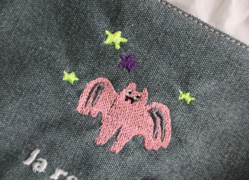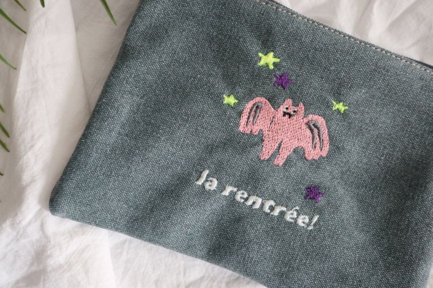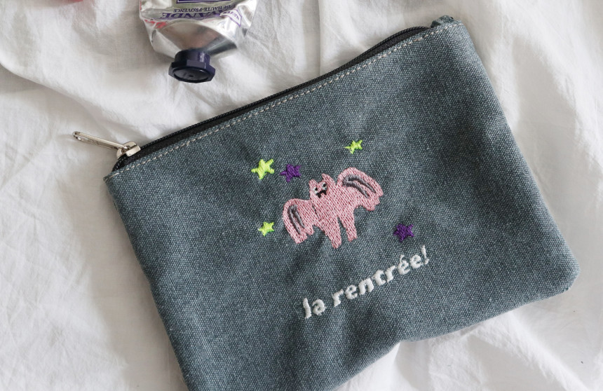 핑크컬러의 박쥐가 유니크한 핸드메이드 자수 파우치예요.