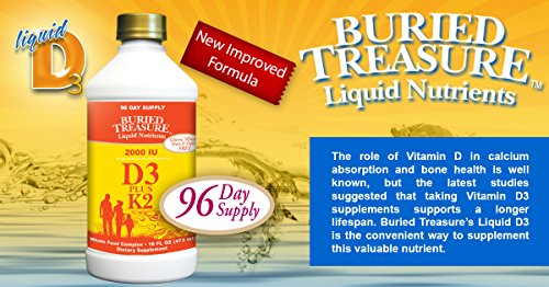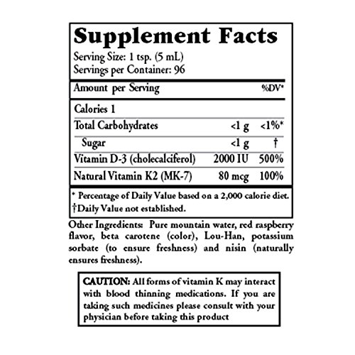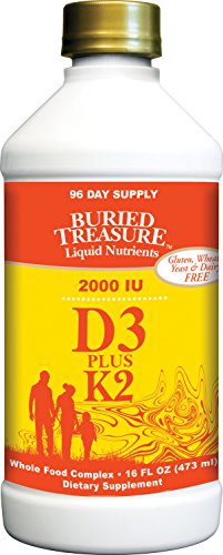 Recent research shows Vitamin D has many protective health benefits. The role of Vitamin D3 in calcium absorption and bone health is well known. Buried Treasure's Liquid D3 plus K2 (MK7) is a convenient way to supplement this valuable nutrient. Other Ingredients: Purified mountain water, red raspberry flavor, beta carotene (color), Lou-Han, potassium sorbate (to ensure freshness) and nisin (naturally ensures freshness).Feature