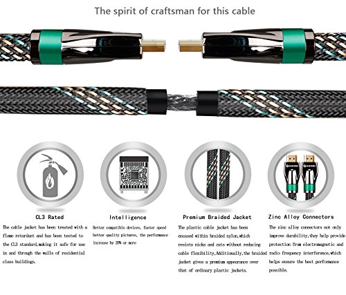 High-Speed HDMI Cable features 24K gold-plated, 99.996% and high purity oxygen-free copper, corrosion-resistant connectors that deliver optimal signal transfer with lower distortion at the point of contact. Ultra-high speed lossless audio and video transmission,This dedication to the digital signal provides sound and picture quality that is truer to the original. high quality PVC, Tough braided exterior outer layer and shielding, purity of the digital signal and longer service life.