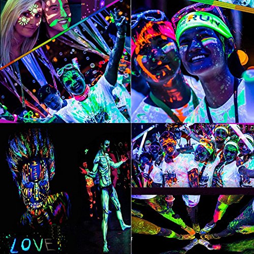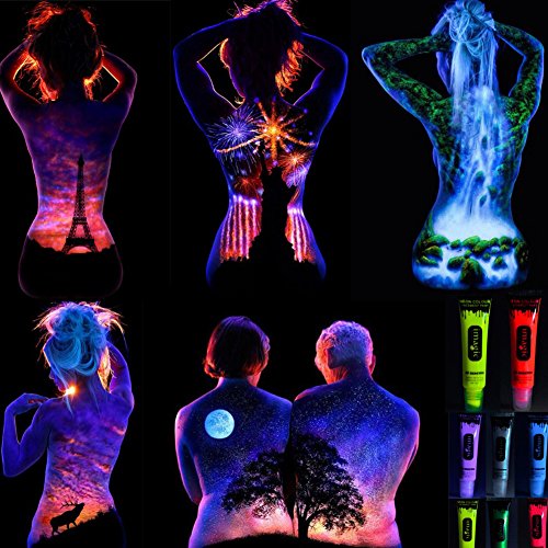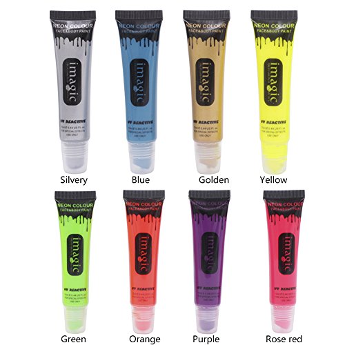 Content: Each delivery contains a set of 8 x neon nights black light body paint in Gold, Sliver, Purple, Rose Red, Green, Blue, Fluorescent Yellow, Orange. Depending on required application, one set contains enough paint for face painting 2-3 persons (or many more!) or body painting 1-2 persons.