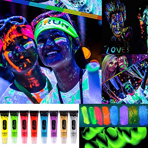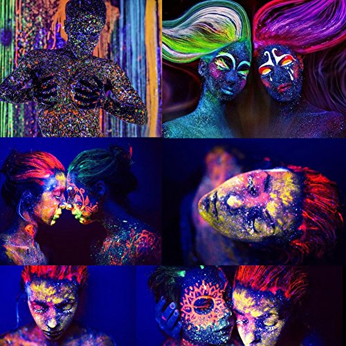 Studio : ZJchao Publisher : ZJchao Binding : Misc. Product Description Details: ? The perfect accessory for parties, festivals, photo shoots, night-outs with friends, and much more ? For make-up face painting or full body painting ? Each pack contains 8 different, brightly glowing colors (Gold, Sliver, Purple, Rose Red, Green, Blue, Fluorescent Yellow, Orange) ? For adults, teenagers, and kids ? Easily removable with soap and water, even from fabrics such as clothing and furniture ? We highly advise using this paint under "true" black light instead of UV LED light for the best effect ? Excellent value for money as a little bit of paint goes a long way ? Net content:13ml