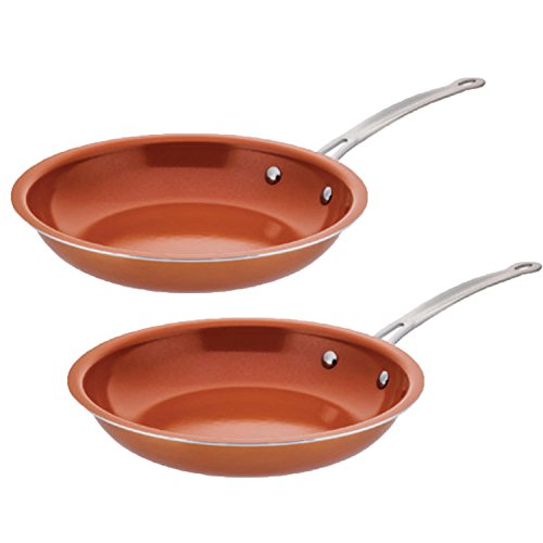 Set of 2 Copper Pans. Non-stick ceramic cookware for today's health conscious consumer. Copper Pan is made without the use of synthetic chemicals PFOA and PTFE yet even the stickiest foods slide right off with ease.Fry eggs, flan desserts, broil savory flaky fish and even caramelize sugar without the need to butter, fat or oil. Versatile enough to be used on the stovetop or oven while withstanding up to 500 degree Fahrenheit temperatures, Copper Pan is the versatile non-stick pan for all your cooking needs. Dishwasher-safe and scratch-resistant surface will provide you with years of dependable service.Feature