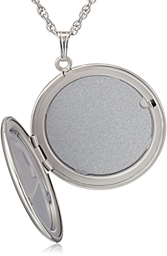 -. Feature : Sterling silver necklace with polished round locket featuring space for two photos / Made in United States