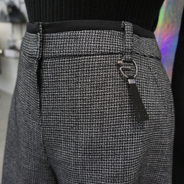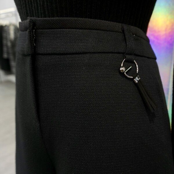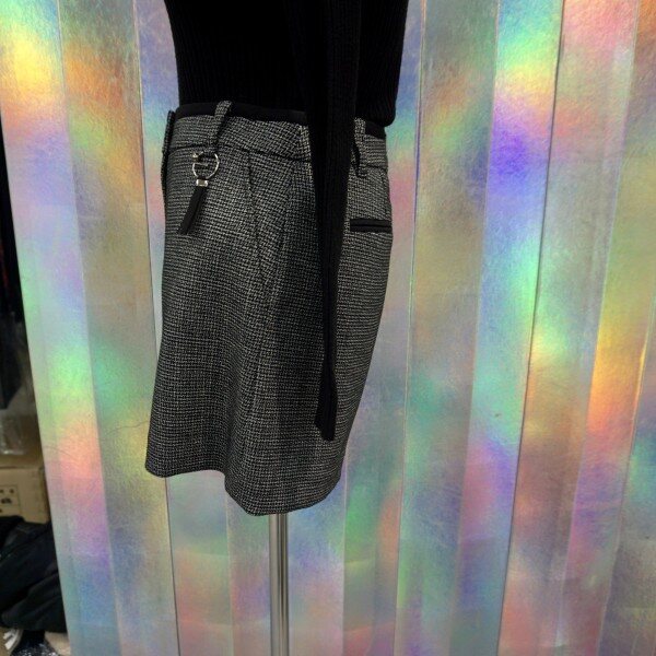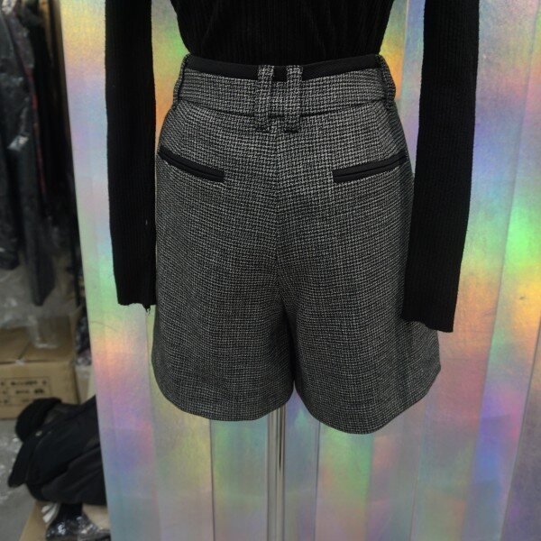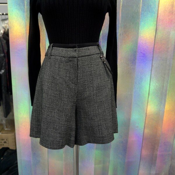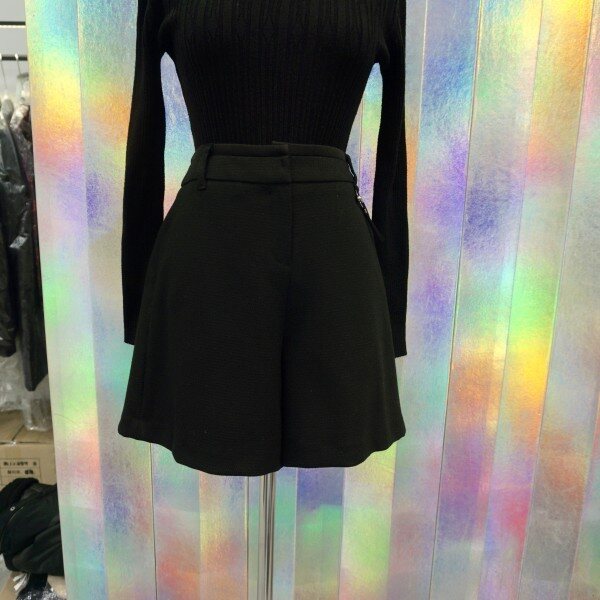 깔끔한 A라인의 모직반바지입니다가죽라인이배색되어있으며 브로치가 포인트입니다