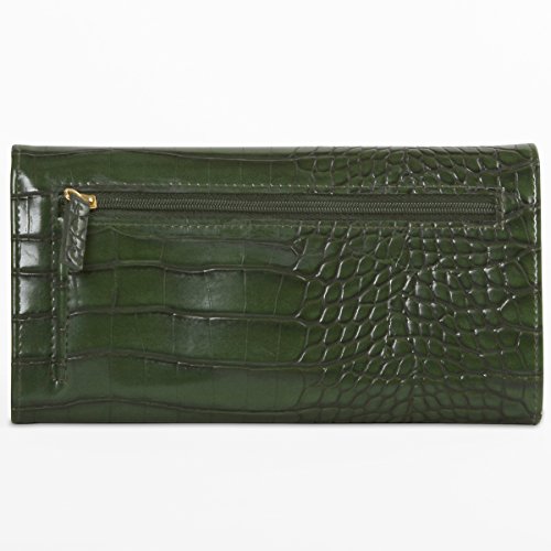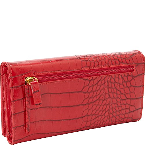 -. Feature : Embossed croco man-made material / Goldstone hardware / Full flap snap closure and outside zipper coin purse / I.d. window, multiple credit card slots and multiple slip pockets / Interior zipper pocket and gusseted slip pocket