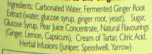 原材料:砂糖、グルコースシロップ、発酵ショウガ根抽出液、生姜、唐辛子、クワガタ草、杜松、西洋ノコギリ草、炭酸、香料(レモン)、酒石酸水素カリウム、クエン酸