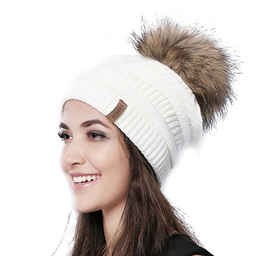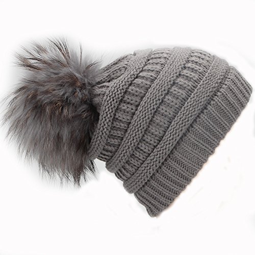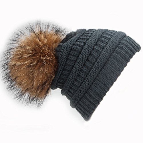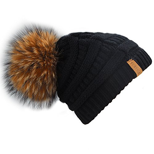 Binding : Apparel Product Description Women's Winter Chunky Knit Beanie Faux Fur Pom Poms Hat Bobble Hat Ski Cap Bat your eyes for the flirty Black Chunky Knit Beanie with Fox Fur Pom Pom from Furtalk. This daytime style is designed with Acrylic chunky knit material and a fun dyed fox or raccoon fur pom pom on the crown. You'll rule the runway with this designer piece.