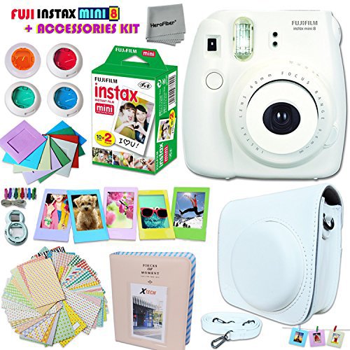 FujiFilm Instax Mini 8 Camera WHITE + Accessories KIT for Fujifilm Instax Mini 8 Camera includes: 20 Instax Film + Custom Fitted Case + Assorted Sticker, Plastic & Paper Frames + Photo Album + MORE