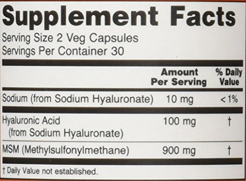 ReleaseDate : 2010-06-17 Studio : NOW Foods Publisher : NOW Foods Binding : Health and Beauty Product Description Hyaluronic Acid is a compound present in every tissue of the body, with the highest concentrations occurring in connective tissues such as skin and cartilage.? Hyaluronic Acid is an important constituent of joint fluid where it serves as a lubricant and plays a role in resisting compressive forces.* Hyaluronic Acid 100 mg, Methylsulphonylmethane 900 mg. 0