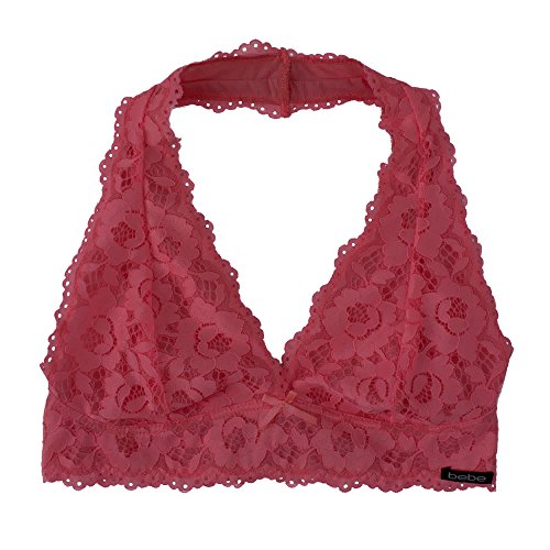 -. Binding : Apparel -. Brand : bebe Intimates -. Department : womens -. Feature : Beautiful floral lace overlay halter bralette cute and sexy / Un padded with sheer mesh floral lace lining / Comfortable and easy back hook and eye closure / Strapless backless halter bralette will make a great layering piece / Hand wash cold with light colors do not bleach, Line dry, Do not Iron, Do not dry clean -. ProductGroup : Apparel -. ProductTypeName : BRA -. Title : bebe Intimates Women's Lightly Lined Floral Lace Halter Bralette Bra Deep V Crop