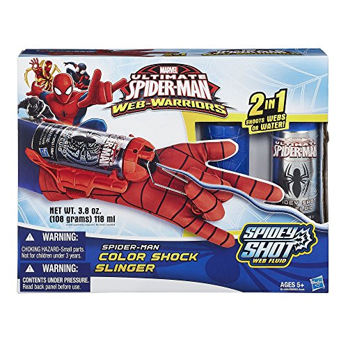 -. Binding : Toy -. Brand : Spider-Man -. EAN : 0630509272631 -. Feature : Fire webs or water just like Spider-Man with the Color Shock Slinger / Load the shooter with web fluid or water / Attach the shooter to the included glove and trigger it with your middle two fingers, just like Spider-Man does / Includes Spider-Man Color Shock Slinger, Spidey Shot Web Fluid, refillable water cartridge, and glove -. IsAdultProduct : 0 -. Label : Hasbro -. Manufacturer : Hasbro -. Model : B1458000 -. MPN : B1458000 -. PackageQuantity : 1 -. PartNumber : B1458000 -. ProductGroup : Toy -. ProductTypeName : TOYS_AND_GAMES -. Publisher : Hasbro -. Studio : Hasbro -. Title : Marvel Ultimate Spider-Man Web Warriors Spider-Man Color Shock Slinger (Classic) -. UPC : 630509272631 -. Warranty : No Warranty
