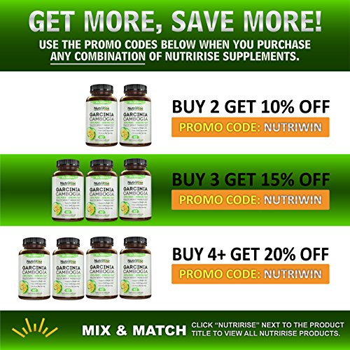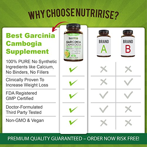 -. Feature : MAXIMUM RESULTS GUARANTEED: The ONLY 100% Pure Garcinia Cambogia Extract in the market (highest potency available) to help you BURN FAT and shed weight fast. Lose weight or your money back! / #1 MOST EFFECTIVE FAT BURNER: This premium Garcinia Cambogia Pure Extract offers 3X MORE per serving. More per serving means less hassle for you! Unlike other brands, you only need to take 2 times a day to lose belly fat and shrink your waist line. / 100% PURE, ALL-NATURAL & SAFE: Endorsed by doctors on TV, this all-natural Garcinia Cambogia weight loss supplement contains pure Garcinia Cambogia HCA from non-GMO garcinia cambogia raw fruit. FREE of gluten, binders, fillers & artificial synthetic ingredients such as calcium, chromium and potassium - to help you experience RAPID weight loss without any side effects! / POWERFUL APPETITE SUPPRESSANT: NutriRise Pure Garcinia Cambogia Supplement is a clinically-proven appetite suppressant and metabolism booster. These Garcinia Cambogia capsules will curb cravings, block carbohydrates and burn fat reserves by converting food into energy instead. / MADE IN USA: Each and every batch of NutriRise Garcinia Cambogia pills are proudly manufactured in a cGMP Compliant and FDA Registered Lab in the United States. Third-Party Certified for Safety & Quality Assurance.