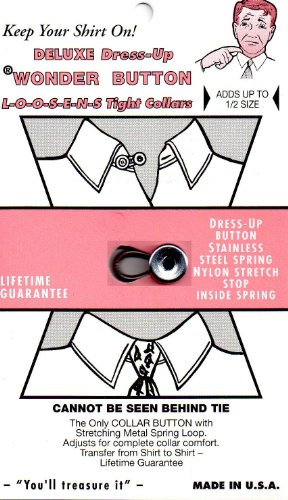 Studio : Competition Inc. Publisher : Competition Inc. Binding : Jewelry Product Description Wonder Button - expands the size of dress shirt collars up to 1/2 inch. For example: a size 16 dress shirt would expand to a 16 1/2 size. Never worry about your shirt collar feeling too tight again. The exclusive Wonder Button is a small button attached to a small expandable stainless steel spring loop. Place the small button into the button hole of your dress shirt collar. Next, place the small loop over the dress shirt collar button. Made to last. This is a patented item with a lifetime guarantee from the manufacturer. The Wonder Button makes dressing nice a comfortable experience. May also be used on dress shirt cuffs creating expansion at your wrists as well. Made in the USA. 0