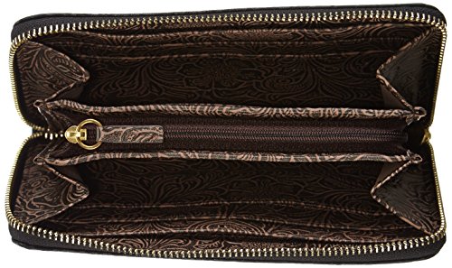 Große Damen Geldbörse von More & More in schwarz. Die Damen Geldbörse hat einen Rundumreißverschluss, 4 Kartenfächer, ein Sichtnetz für den Ausweis. Ein Münzfach mit Reißverschluss und zwei Scheinfächer. Das Damen Portemonnaie hat vorne ein More & More Logo in goldfarben mit braun-dunkelbrauner Verzierung rundum.