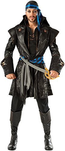 -. Binding : Apparel -. Brand : Rubie's -. Department : mens -. Feature : Captain blackheart deluxe costume includes jacket, lace-up shirtfront, blue and black striped waist sash, and matching head scarf / Distressed black jacket features faux leather trim, shank buttons, and skull and crossbones cuff links / Standard fits a 42 to 44-inch jacket size and 34 to 36-inch waist / Pair with coordinating rum runner pirate by Rubie's for a great couple's costume / Rubie's offers holiday and novelty costumes and accessories in sizes and styles for the entire family -. Genre : Classic -. IsAdultProduct : 0 -. Label : Rubies Costumes - Apparel -. Manufacturer : Rubies Costumes - Apparel -. PackageQuantity : 1 -. ProductGroup : Apparel -. ProductTypeName : ADULT_COSTUME -. Publisher : Rubies Costumes - Apparel -. Studio : Rubies Costumes - Apparel -. Title : Rubie's Costume Co Men's Captain Blackheart Costume