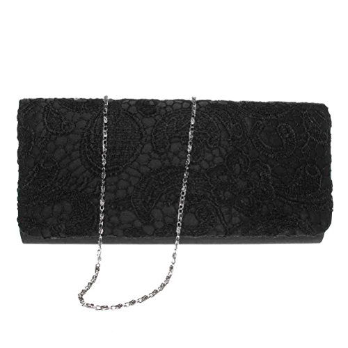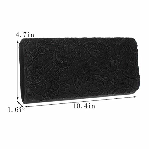 -. Feature : UNIQUE DESIGN: This clutch purse is made of high quality lace, chic and noble / DIMENSION: 10.4 (L) * 4.7 (W)* 1.6 (H) Inch; This big capacity clutch purse can fit everything you need (smartphone, a few bobby pins, eyeglass, makeup products) / SAFE CLOSURE: Flap with magnetic snap closure, AVOID YOUR BELONGINGS SLIPING / CARRYING OPTIONS: You can hold this clutch purse IN YOUR HAND or you can also use it as a SHOULDER BAG or CROSS BODY BAG with the chains coming with the bag (detachable strap is 46.49 inch ) / OCCASIONS: Great for wedding, party, prom, fancy events. Just get this clutch purse to have a wonderful night