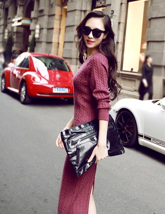 クルーネック タイト 長袖 無地 ロング カジュアルスタイル ニットワンピース