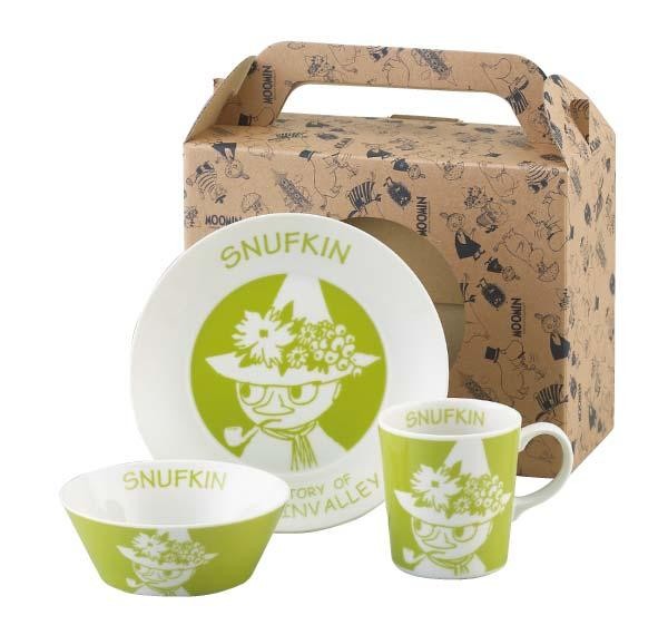 スナフキンの顔が大きく描かれたプレート、ボウル、マグの3点セットです。 |