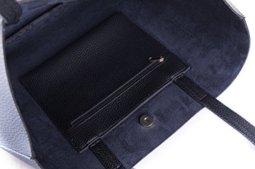 -. Feature : Wipe clean only / An Amazon brand / Pebble grain pu / 20"(L) x 6.25"(W) x 13'(H) / Unlined tote with faux leather-like base backing. Logo magnetic snap closure. Large pom pom charm deco. Inside hanging zip pocket.