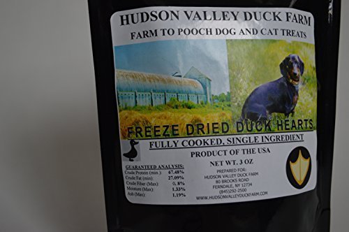-. Binding : Misc. -. Brand : Hudson Valley Duck Farm -. EAN : 0642213170738 -. Feature : Farm to Pet - Limited Single Ingredient Treat Dogs and Cats Love / Healthy Muscle Meat Treat - Packed with Protein - Zero Grains / Made in NY - Product of the USA / Great For Training or Treating Every Day / Each Bag Contains 3oz of Freeze Dried Duck Hearts and Nothing Else -. Label : Hudson Valley Duck Farm -. Manufacturer : Hudson Valley Duck Farm -. Model : HVDF-DH3 -. MPN : HVDF-DH3 -. NumberOfItems : 1 -. PackageQuantity : 1 -. PartNumber : HVDF-DH3 -. ProductGroup : Pet Products -. ProductTypeName : PET_SUPPLIES -. Publisher : Hudson Valley Duck Farm -. Size : 3 oz -. Studio : Hudson Valley Duck Farm -. Title : Hudson Valley Duck Farm Freeze Dried Duck Heart Dog and Cat Treats -. UPC : 642213170738