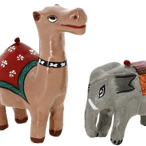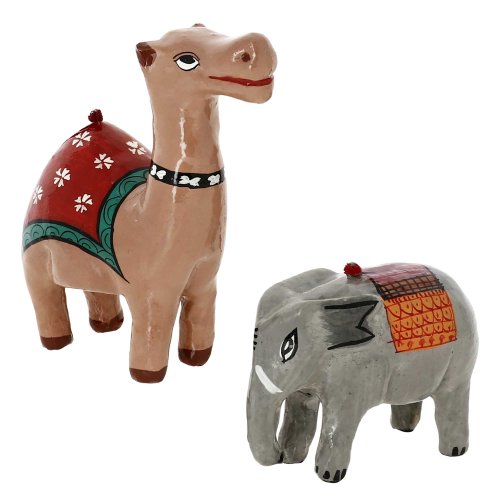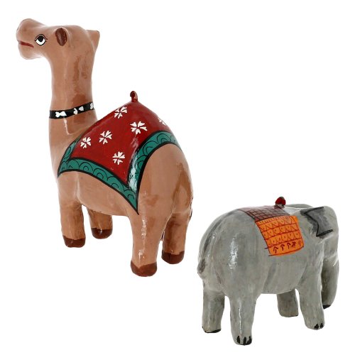 Handcrafted Paper Mache Camel and Elephant Ornaments - Hanging Figurines for Christmas Decorations - Set of 2