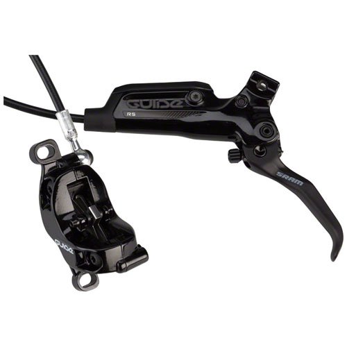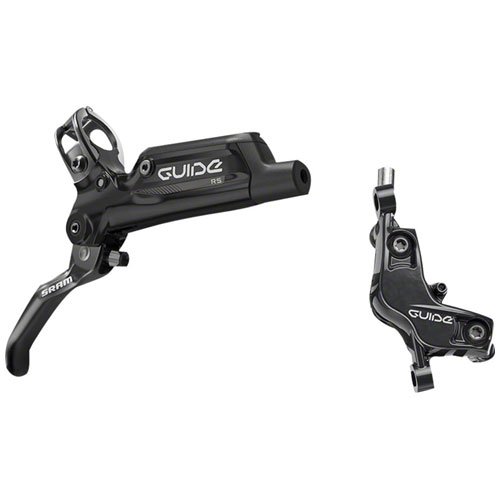 When dropping into your favorite flowy run, it's nice to know you've got SRAM Guide RS (B1) Disc Brakes along for the ride in the event of an unexpected mid-trail moose sighting or the perfect #autumncolors photo op. The Guide RS utilizes SRAM's Timing Port Closure, with a sliding cup seal and port mechanism that provides immediate actuation with a light pull action. The Swinglink lever facilitates powerful modulation, with a proprietary cam shape that's claimed to eliminate the jarring on/off feeling found in other disc brake systems so you won't get thrown over the bars when you mash on the brakes in front of that moose. As an extra bonus, the lever features Reach Adjust to quickly personalize your setup.These brakes feature SRAM's new S4 caliper with Bleeding Edge design that updates the fluid and bleed routing for easier brake maintenance, with a bleed adapter plug that seals off the system from air and dust. The new caliper also boasts SRAM's Heat Shield technology, which consists of stainless steel shields that buffer the connection between the pad and caliper body to reduce head transfer to the hydraulic fluid and reduce its temperature by a claimed 20-degrees Celcius under heavy use.Note that the Guide RS Disc Brake comes in either front/left or rear/right variants, with included lever and caliper configuration. It's compatible with SRAM's Centerline Rotors (sold separately) and uses DOT 5. 1 fluid. Additionally, the Guide R is Matchmaker and Matchmaker X compatible, meaning you can run multiple controls off one lever clamp for a more streamlined set-up.Feature